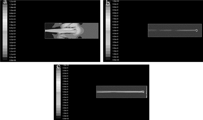 經光液耦合后的水束噴射到空氣中的情況是比較復雜的。水束會在噴口處發生縮流,水束會突然縮小為原來的80%,然后水束在空氣壓力的作用下,其直徑又慢慢變大,最終導致激光束從水束中逃逸。噴嘴口的大小和水束的流速均會影響噴射流長度,本次仿真選取水束壓力為20MPa,依次對0.3mm, 0.4mm0.5mm 3種口徑噴嘴射出的水束穩定性進行仿真,如圖 7所示。本次仿真設置的邊界為100mm。