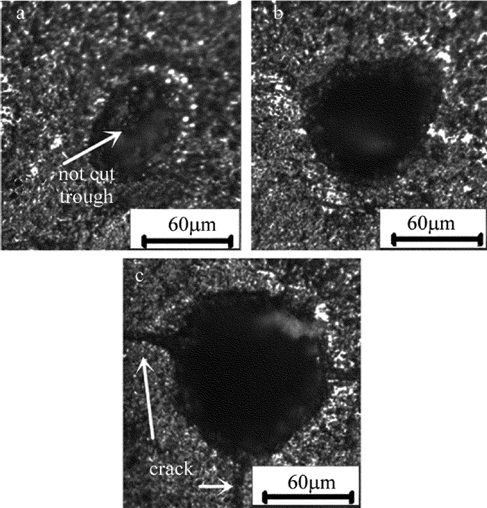 從燒蝕閾值來看,完成PCBN去除僅需要微小能量,但對于2mm厚的PCBN來講,實現(xiàn)高效的激光切割能量遠遠不夠,能量過小會造成如圖 3a所示的切不透現(xiàn)象。同時多次試驗表明,過小能量切割PCBN表面粗糙度較差。由于PCBN材料的脆硬性影響,能量過大則會出現(xiàn)嚴重的崩邊與裂紋,如圖 3c所示。在圖 3b中看到,孔右上角部分呈現(xiàn)橢圓形貌,那是因為激光光束垂直度不足導致,該現(xiàn)象也是導致切縫較寬表面質(zhì)量差的一個重要原因。