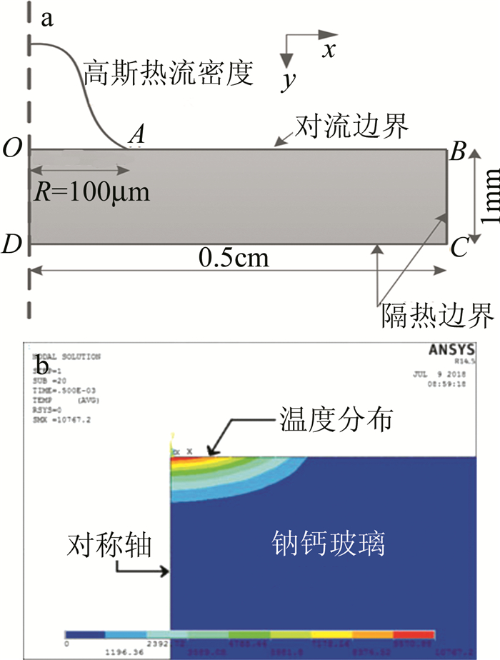 a—2維對(duì)稱瞬態(tài)傳熱模型b—單次激光脈沖后的溫度分布