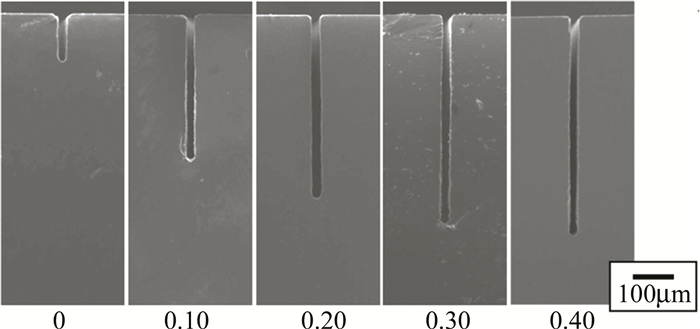 對(duì)于激光誘導(dǎo)背部濕法刻蝕,溶劑材料種類和激光工藝參量的選取都對(duì)刻蝕質(zhì)量有較大的影響。EHRHARDT等人以甲苯溶液為液體介質(zhì),采用355nm和266nm的皮秒激光對(duì)石英玻璃進(jìn)行刻蝕,發(fā)現(xiàn)甲苯溶液中芘的含量對(duì)去蝕率有較大影響,且在一定范圍內(nèi)芘的含量越高,去蝕率越大。KWON等人提出在使用波長(zhǎng)為1064nm、脈寬為100ns的近紅外激光刻蝕鈉鈣玻璃的過程中,可通過在吸收劑中加入磷酸抑制裂紋的產(chǎn)生,通過對(duì)比不同磷酸質(zhì)量分?jǐn)?shù)(0~0.40)的吸收劑刻蝕效果(如圖 5所示)發(fā)現(xiàn),加入磷酸后,可刻蝕深度提高了約5倍(從103μm提高到530μm),且側(cè)壁的粗糙度從0.55μm下降到0.16μm;此外,通過調(diào)整溶液中的磷酸濃度,可以制備出多種不同形狀及深寬比的微通道。SUN等人利用飛秒激光分別在空氣、水和乙醇中加工熔石英玻璃,結(jié)果表明,以乙醇為吸收介質(zhì)時(shí),熔石英玻璃的燒蝕閾值從2.22J/cm2降到了1.02J/cm2,進(jìn)一步研究發(fā)現(xiàn),刻蝕時(shí)乙醇比水需更低的激光能量便能達(dá)到形成等離子體的電子密度,同時(shí)激光誘導(dǎo)等離子體形成后會(huì)在液體中產(chǎn)生氣泡,酒精中的氣泡比水中的對(duì)石英表面的沖擊壓力更大。